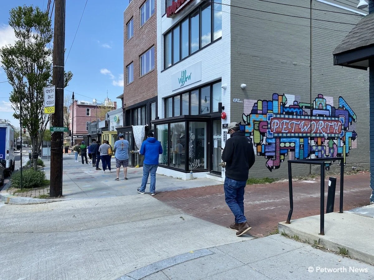 /Customers lined up — 6 feet apart — to pick up orders from Lulabelle’s Sweet Shop on Upshur Street NW.